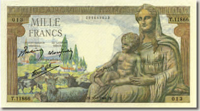 Mais pour battre, voire pulvériser certains records, je pense qu'il faut aller chercher d'autres coupures pour l'instant moins célèbres. Si un billet est unique et fait un gros prix, il risque de ne pas être battu de sitôt car la coupure pourra jalousement rester plusieurs années dans une collection. Si un billet recherché par tous est extrêmement rare et connu à seulement quelques exemplaires, il restera toujours une chance de pouvoir l'acquérir un jour. Chaque nouvelle vente risque de voir le prix du billet nettement progresser, et ce, proportionnellement à la déception de ne pas avoir pu l'acquérir jusqu'alors. Je suis certain qu'un des 6 rarissimes billets très convoités du 1000 F Déesse Déméter datés de 1944 a tout pour devenir un des exemples les plus significatifs de ce phénomène.